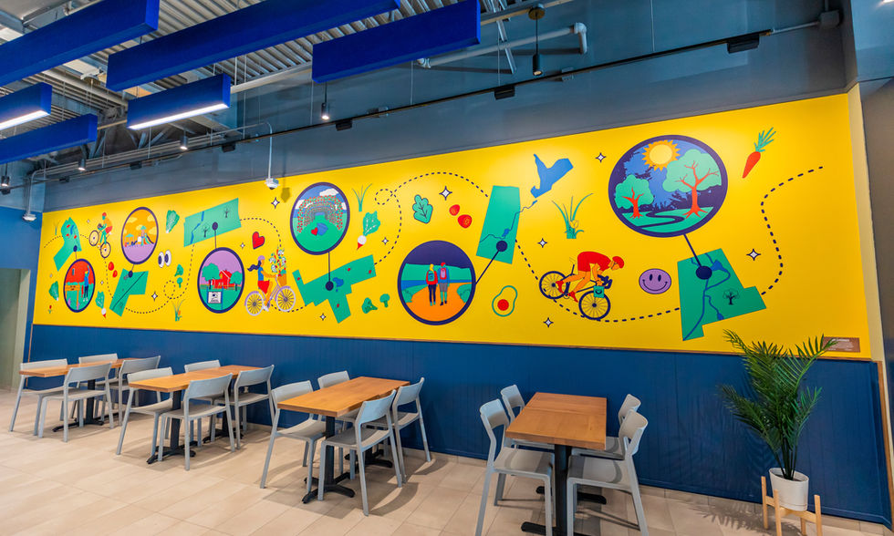 Playful abstraction and local Clifton landmarks celebrate New Jersey’s love for Just Salad. Subtle nods to the town’s environment and history seamlessly integrate with Just Salad’s vibrant branding, showcasing how this location complements the active lives of Clifton residents.